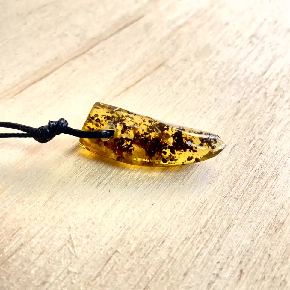 This piece showcases the organic character of amber at its best. The polished surface reveals a living contrast of light and shadow, creating a subtle, ever-changing glow. When worn, the pendant catches the light beautifully, echoing the flicker of fire through trees — grounding, radiant, and endlessly captivating.