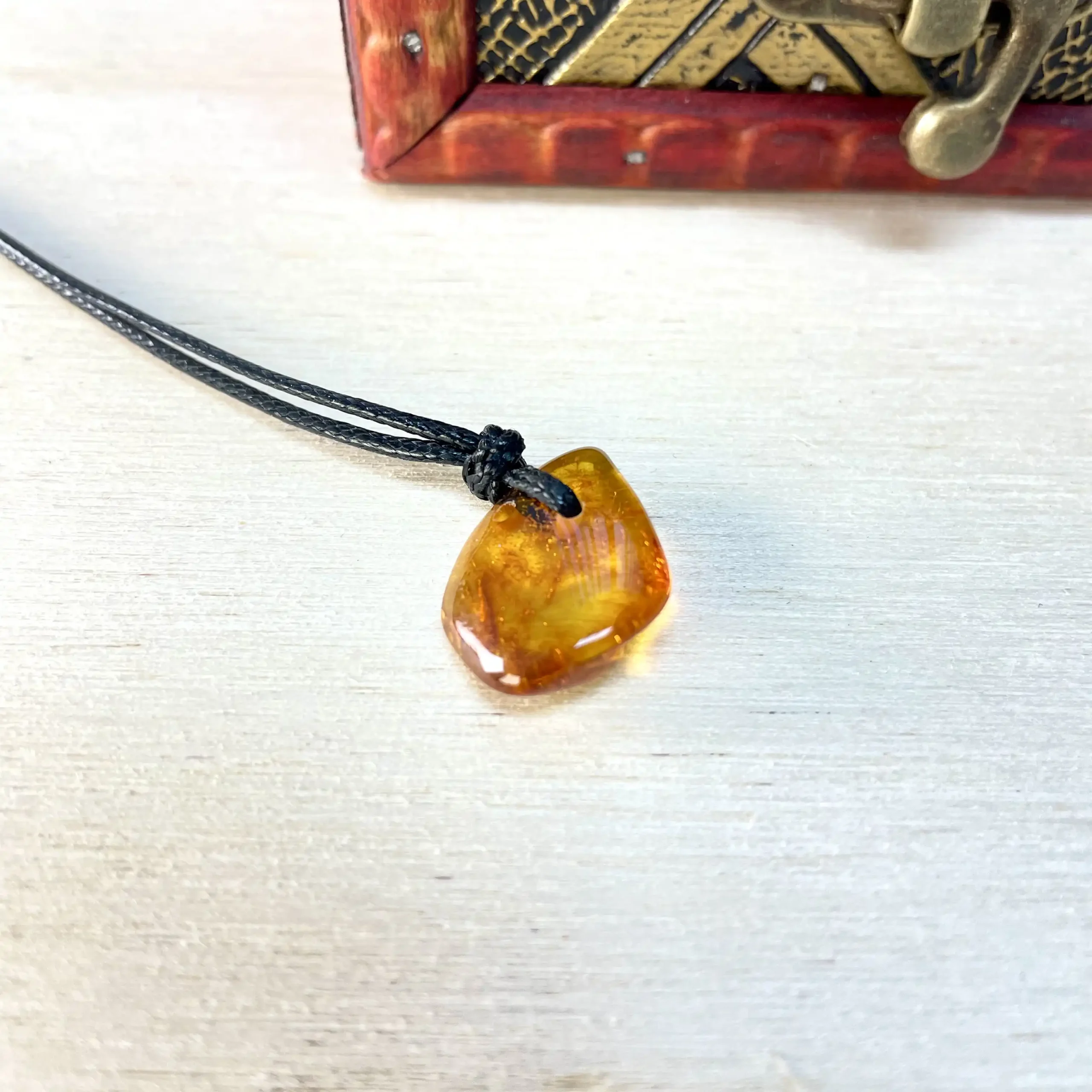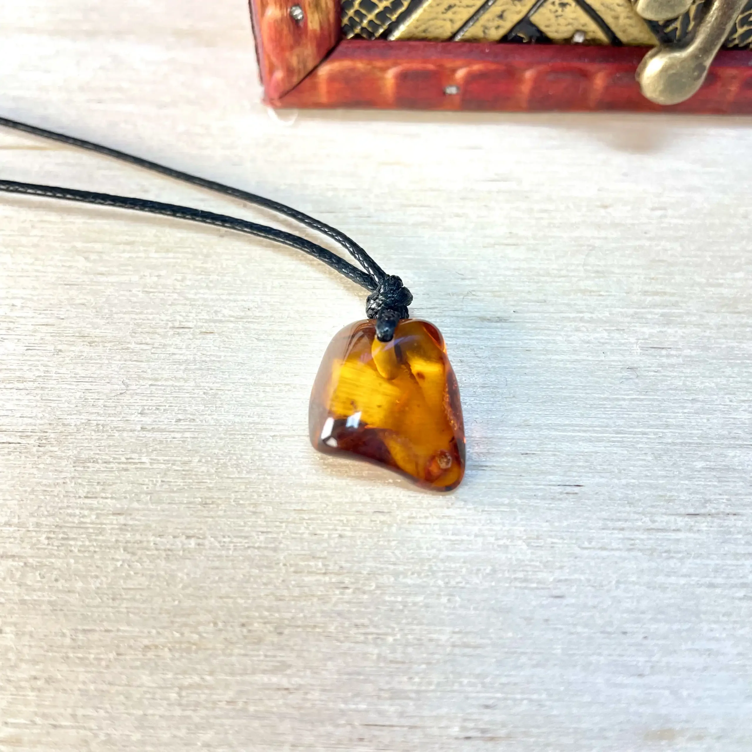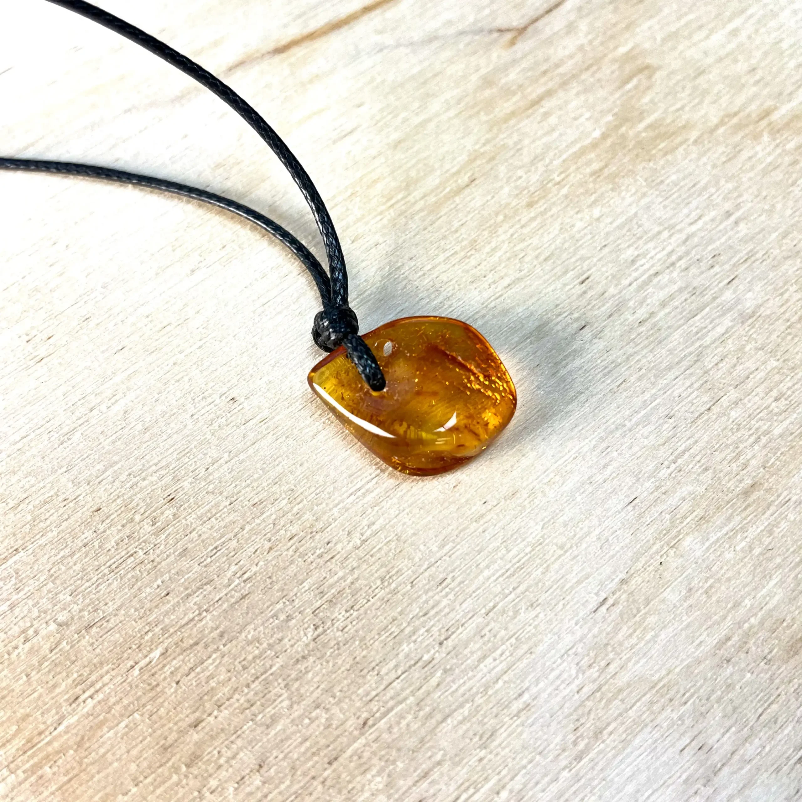 A simple black cord complements the amber’s warm tones. Furthermore, the adjustable length allows you to style the necklace with different necklines and outfits. Because the pendant is lightweight and smooth, it feels comfortable for everyday wear. You can pair it with casual clothing for a natural look or combine it with more refined pieces for contrast. In both cases, the necklace adds a grounding, earthy presence.