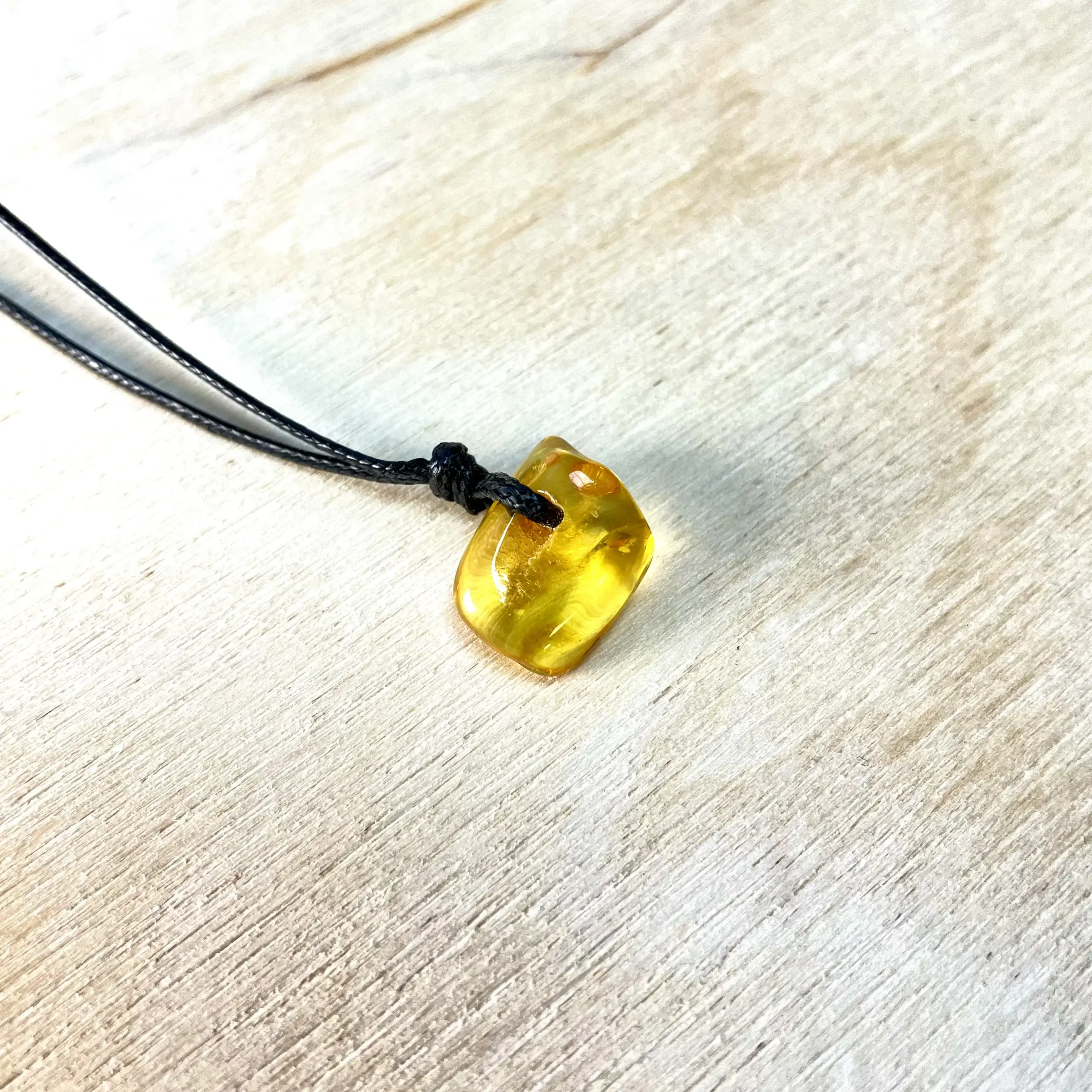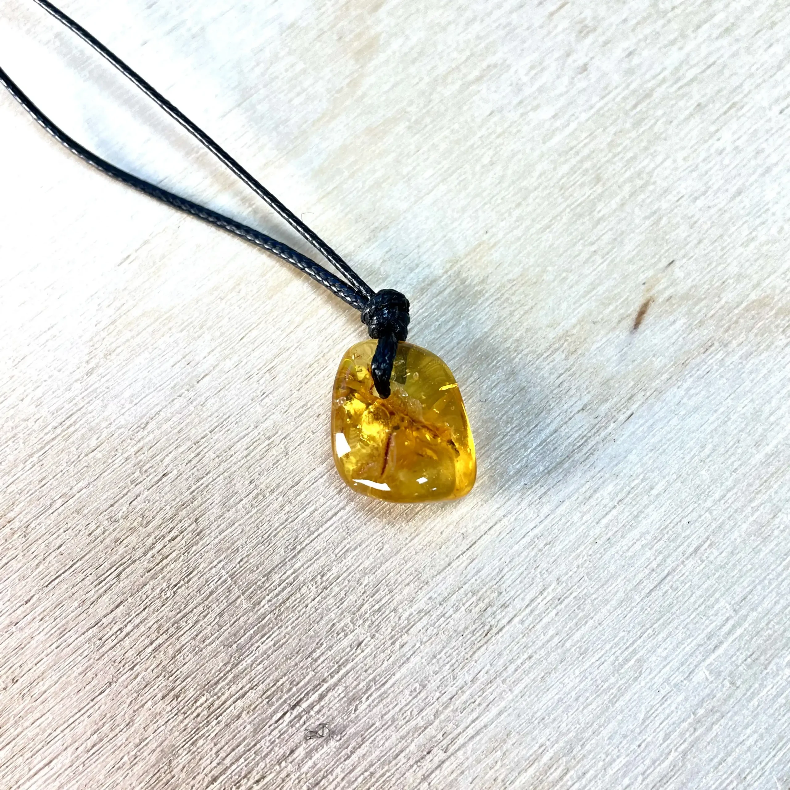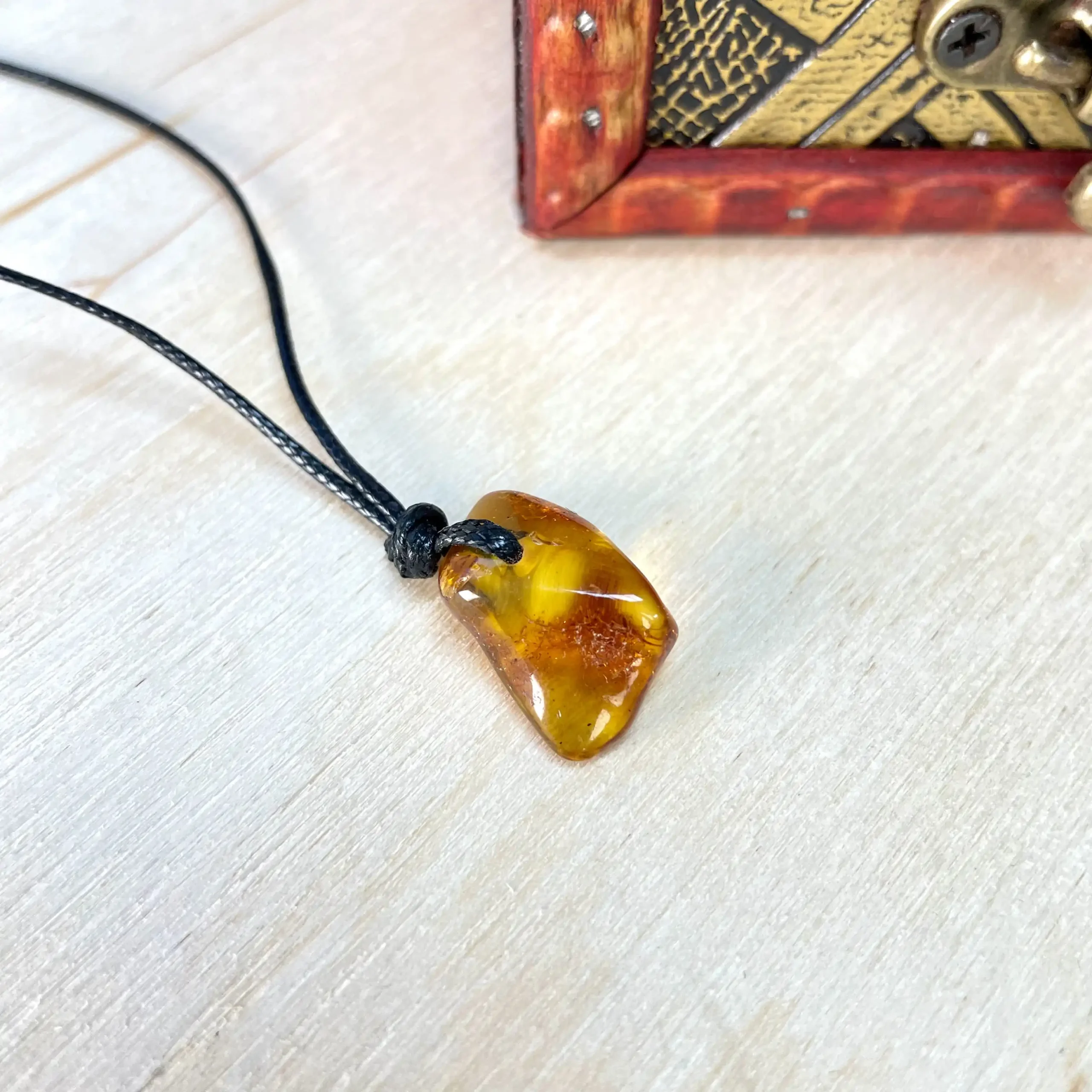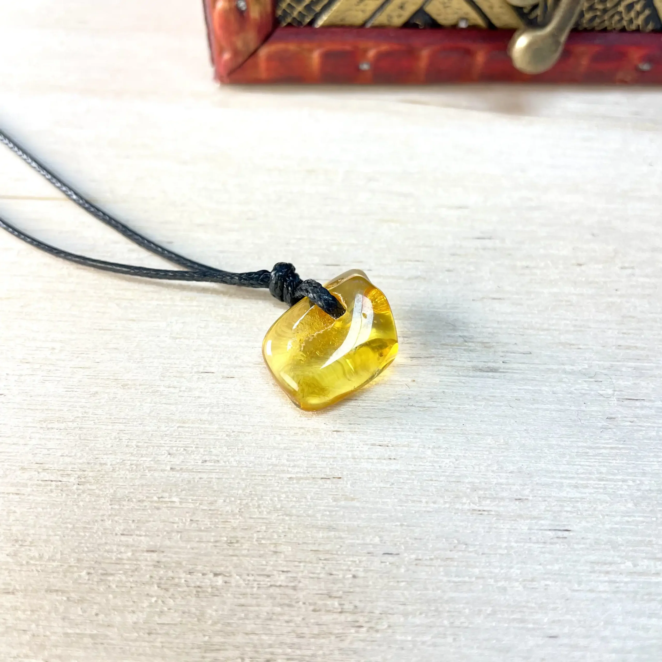 A simple black cord complements the amber’s warm tones. Furthermore, the adjustable length allows you to style the necklace with different necklines and outfits. Because the pendant is lightweight and smooth, it feels comfortable for everyday wear. You can pair it with casual clothing for a natural look or combine it with more refined pieces for contrast. In both cases, the necklace adds a grounding, earthy presence.
